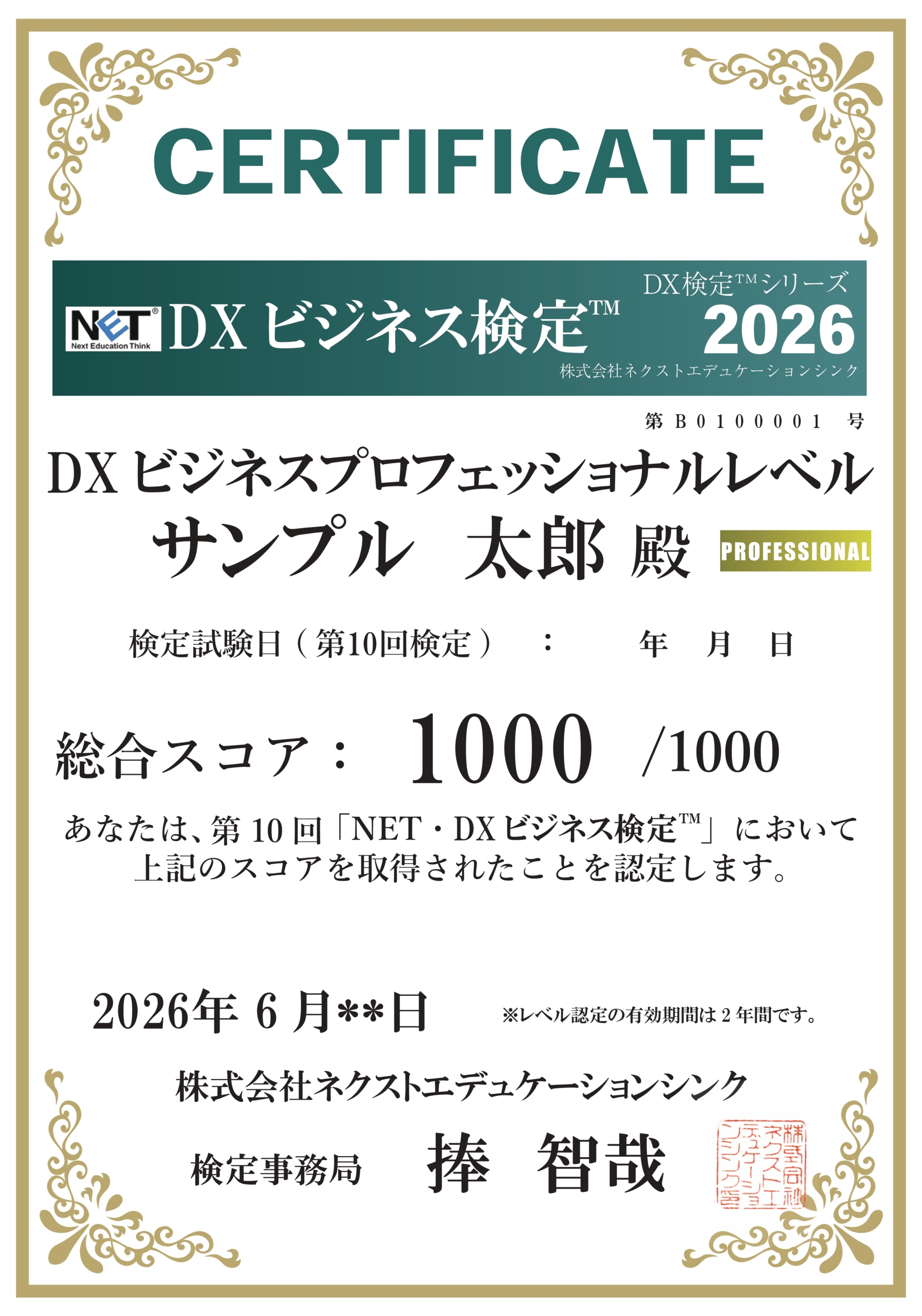 なお、「DX検定™」、「DXビジネス検定™」は、いずれもレベル認定制度を実施しており、成績優秀者はスコアに応じ、レベル認定証(2年間有効)が発行され、名刺等にも記入が可能となります。 <レベル認定概要> スコア800以上⇒「DX/DXビジネスプロフェッショナル レベル」認定 スコア700以上⇒「DX/DXビジネスエキスパート レベル」認定 スコア600以上⇒「DX/DXビジネススタンダード レベル」認定 DXビジネス変革を目指す企業におきましては、まずは自社の社員の方々全員で「DX/DXビジネス スタンダードレベル」を目指し、「DX」「DXビジネス」の全体像を理解いただき、デジタル意識変革のきっかけとしていただく。さらに次の目標として「DX/DXビジネスエキスパートレベル」、最終的には「DXプロフェッショナルレベル」を目指していただき社内でDX推進で活躍されることをお勧めしています。