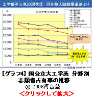 【グラフ4】をご覧ください。これは、国公立大学「工」学系志願者の減少傾向が、その特定の分野で集中的におきているかどうかを調査したものです。ITという視点から見てみますと、「電気・電子」「通信・情報」が下降傾向にありますね。【グラフ5】は私立大の傾向ですが、「電気・電子」「通信・情報」の下降傾向はさらに酷くなります。