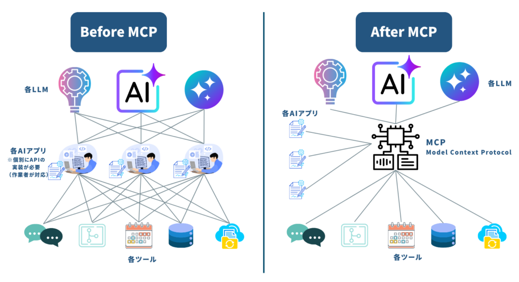 MCPはその接続方法を共通化し、AIが複数のシステムを横断して使えるようにします。
