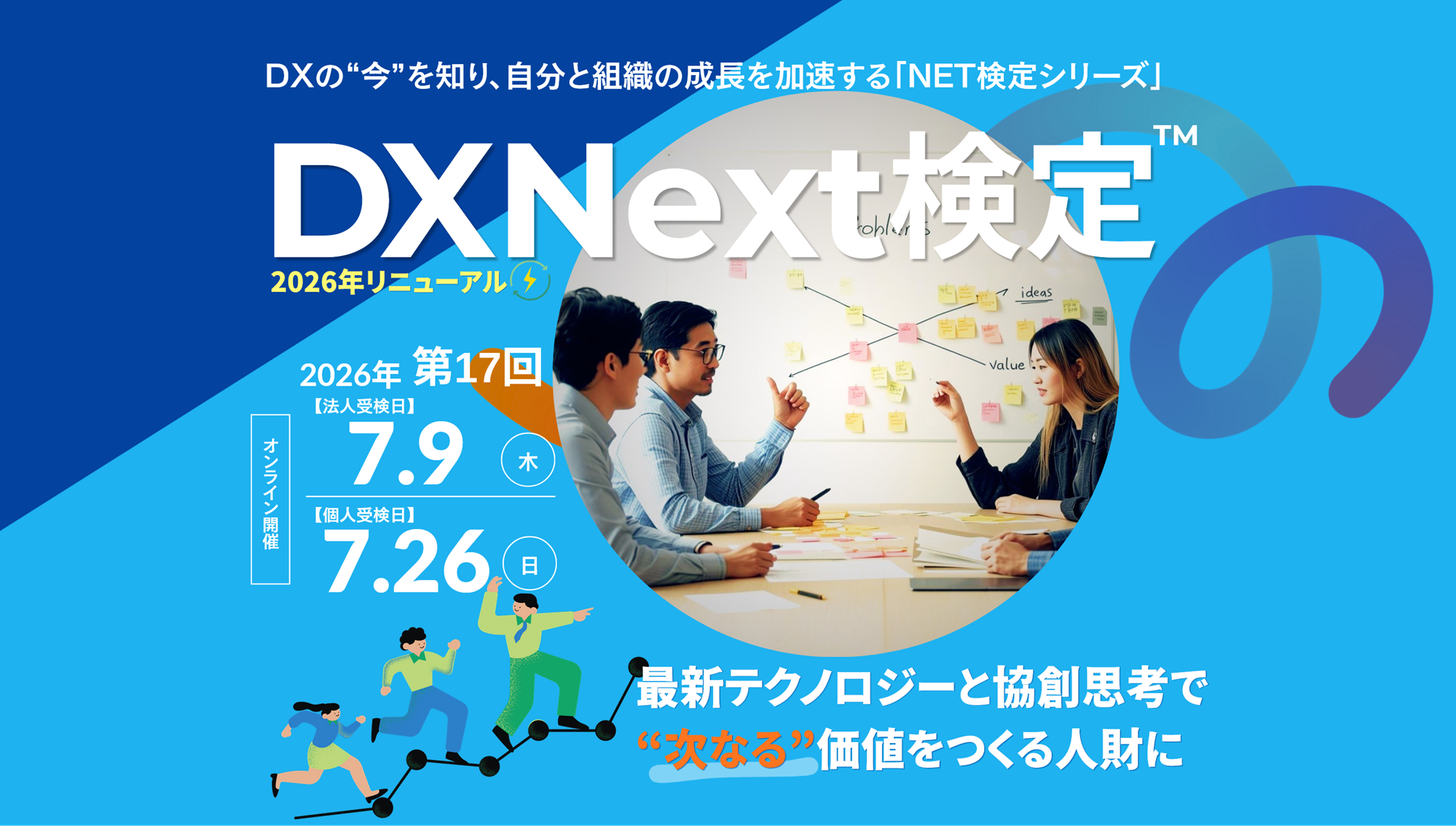 「DX Next検定™」は、DX・生成AI時代に生きる全てのビジネスパーソンをDX人材へ導くことを目的とした「NET検定シリーズ」の中核検定です。
