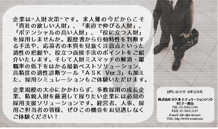 さらに、誰でもがわずか7分で応募者の本質を客観的に判断できてしまう適性診断プログラム「ASK Ver.3 」を、体験いただきます。合わせてこのプログラムの実際の活用事例を多数ご紹介します。