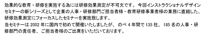 企業における「研修」とは、そもそも何のために行っているのかをインストラクショナルデザインの視点から考え、最終目標や研修目的別にどのような「効果測定」をしたら良いのかを修得します。また、運用上の注意点にも触れながら受講者御自身の「課題」からアクションプランを作成し、研修効果測定における今後の「課題」を明らかにしていきます。