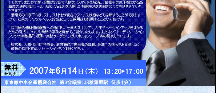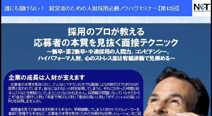 応募者の一枚の履歴書から、「本人がこれからどのような行動をとるか」「本当に会社に貢献できる人物なのか」それら行動特性を判断する手法を具体的に紹介します。また面接の際、応募者の本質を見抜くための意外な注意ポイントとは・・・など。 さらに、誰でもがわずか7分で応募者の本質を客観的に判断できてしまう適性診断プログラムの最新バージョン「ASK Ver.3」を、実演をまじえてご覧いただきます。合わせてこのプログラムの実際の活用事例を多数ご紹介します。