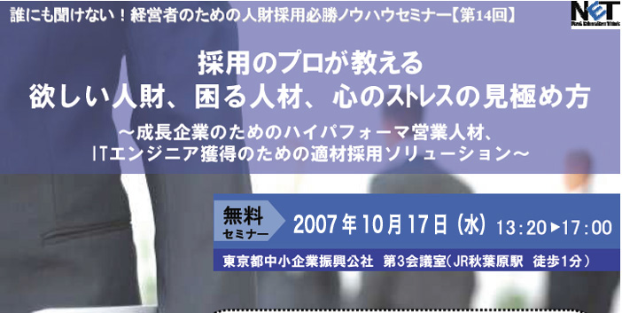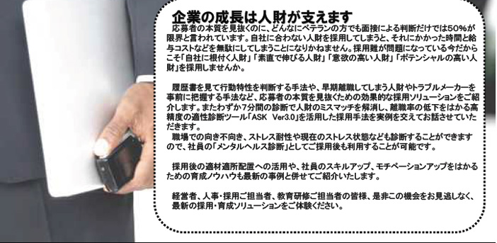 企業が新卒・第二新卒に期待する若年層基礎知識・コミュニケーション力、中途採用や営業人財に期待する人間力、コンサル営業力、ITスキルなどを、短時間で客観的・総合的に把握することができる最新人事 ・適材適所配置 ソリューションをご紹介します。また、 内定者、新入社員、派遣社員の個人情報保護・コンプライアンス面でのリスク度がインターネットで簡単に把握できる必須アセスメ ントツール、経済産業省のITスキル標準に準拠した「ITSSレベルチェッカー」などなど・・・いま注目の診断コンテンツ群、人事情報システムにも繋げる企業スキル管理システムを一挙公開いたします。