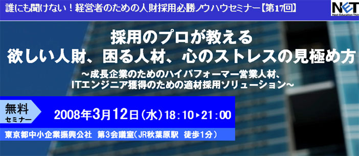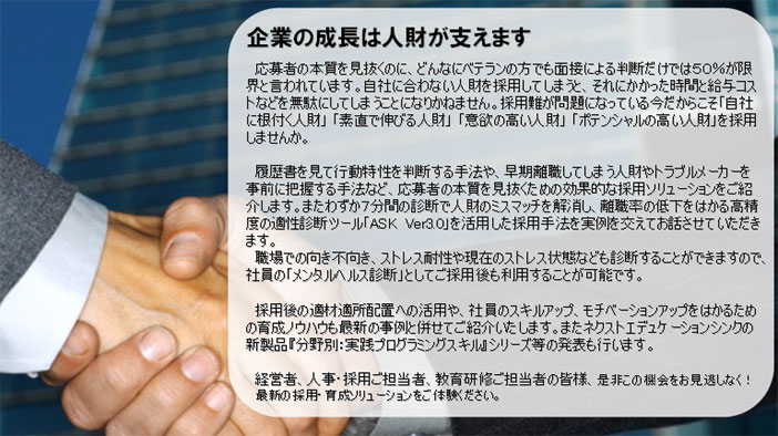 企業が新卒・第二新卒に期待する若年層基礎知識・コミュニケーション力、中途採用や営業人財に期待する人間力、コンサル営業力、ITスキルなどを、短時間で客観的・総合的に把握することができる最新人事 ・適材適所配置 ソリューションをご紹介します。また、 内定者、新入社員、派遣社員の個人情報保護・コンプライアンス面でのリスク度がインターネットで簡単に把握できる必須アセスメ ントツール、経済産業省のITスキル標準に準拠した「ITSSレベルチェッカー」などなど・・・いま注目の診断コンテンツ群、人事情報システムにも繋げる企業スキル管理システムを一挙公開いたします。