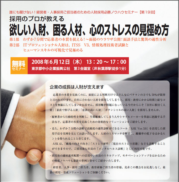 IT 企業、ユーザー企業がIT プロフェッショナル人材に期待する実務スキルには、ITSS、UISS、ETSSで定義された技術スキル、業界知識・製品知識とともに、併せてヒューマンスキルやコンピテンシーも必須である。「技術力」+「人間力」「社会人基礎力」を総合的に可視化して、企業にとって本当にハイパフォーマンスで最適な人材を見極め採用する最新ソリューションを公開。また、当日、客観テスト型診断で実務スキル測定の新時代を拓いた最新の「ITSSレベルチェッカー(ITSS V3・新情報処理技術者試験対応版)」を発表いたします。この機会に、採用、適材適所配置・育成での活用や、企業ごとのオリジナル採用診断・コンプライアンス診断の開発などの可能性をご確認ください。 |