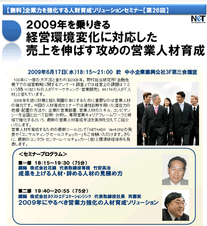 営業資質を見るスキル診断を用いたハイパフォーマーの抽出、発見、強化。さらに適材適所配置の方法や、企業のブランド力や商品力の部分を除いた本当の営業人材だけの力、スキル、コンピテンシーを全国レベルと比べて診断・分析し、営業組織をきっちりサーベイして、売れる組織を創る新しい客観的な分析手法を紹介いたします。標準のセールスキャリアフレームワークに基づいた最新の診断・組織分析・育成ソリューション対応の教育体系やその活用方法もご紹介いたします。またこの春に実施された新情報処理技術者試験の分析と報告をさせていただきます。ニーズが高いコンタクトセンターレベルチェッカーと標準キャリアフレームワーク、研修体系をご紹介いたします。 |