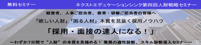 ・経済産業省の「ITスキル標準」に対応して各職種ごとのスキル熟達度が測れる「ITSSレベルチェッカー」・コンサル営業力が客観的に測定できる国内初の「コンサルティング・セールス・チェッカー」 ・パソコンの本当の実操作スキルがその場でわずか10分で測れる「 OfficeDo 」 ・内定者、新入社員、派遣社員の個人情報保護・コンプライアンス面でのリスク度が把握できる診断ツール、などなど・・・話題の選りすぐりの必見診断コンテンツ群、企業スキル管理システムを一挙公開。この機会に採用、適材適所配置、育成での活用や、自社オリジナル診断の作成等を検討してみませんか。当日は、最新の診断システムを初公開いたします。ぜひ、この機会にご参加ください。
